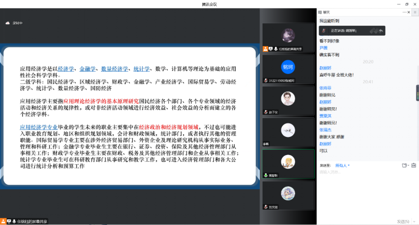 经济与金融学院姚智昕同学从应用经济学的含义出发,介绍其主要研究内容,并从国际贸易学、金融学、财政学、统计学等不同方向,有针对性地对不同专业的未来职业选择进行详细讲解,引发学生对专业课程学习的深度思考。