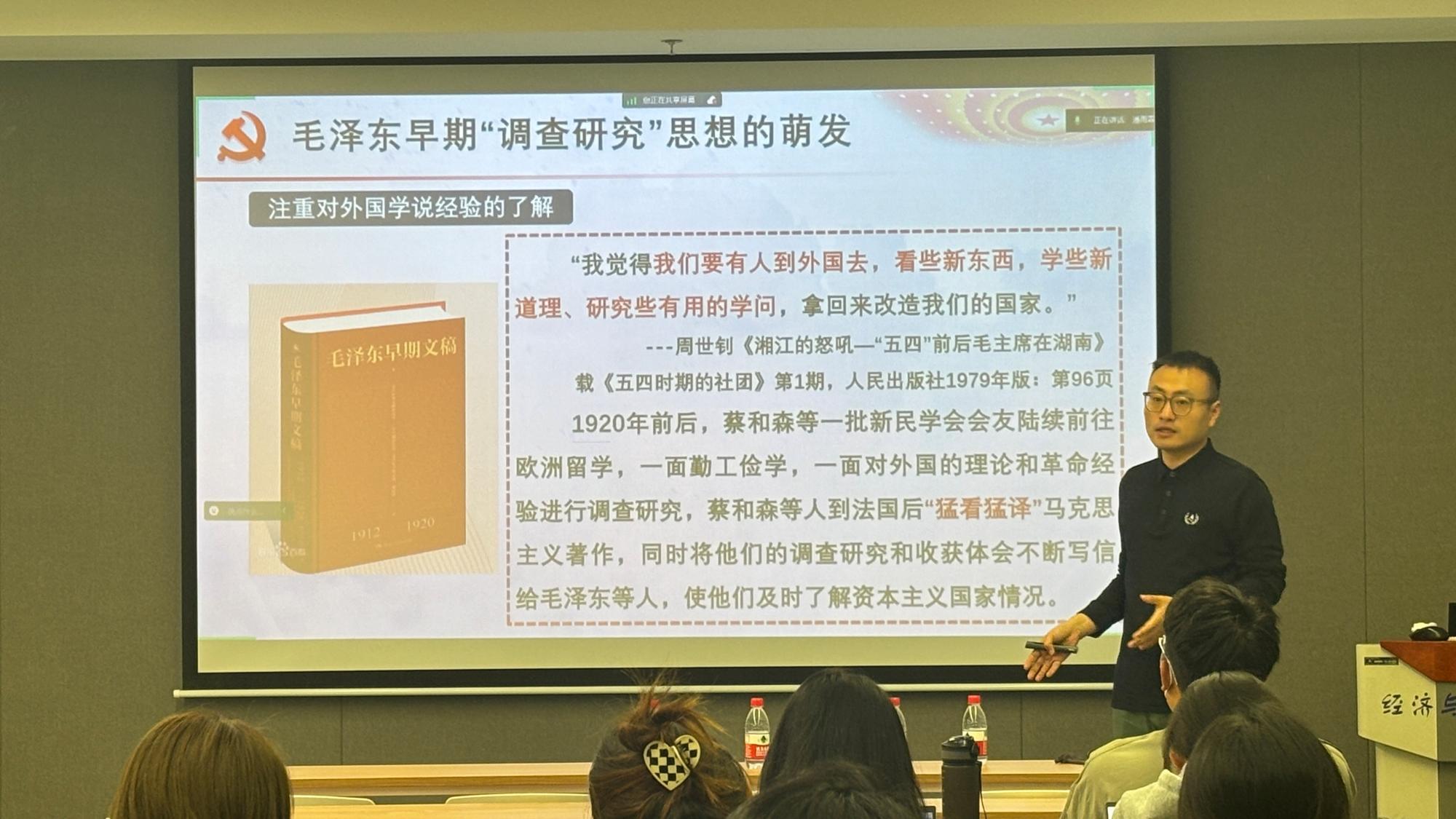 学有所得,筑牢思想桩基。理论培训部分紧紧围绕党的实践理论、党内法规和党的基本知识并结合学院专业实际开展系统培训。先后邀请了马克思主义学院副教授刘源老师、经金学院教授李江龙老师、党委组织员董娜老师以及辅导员王平老师为同学们开展专题授课。刘源老师以《毛泽东调查研究的理论和实践》为主题,强调“没有调查,就没有发言权”,敦促学生们科研工作一定要坚持实事求是的原则,善于调查研究,勇于实践创新。李江龙老师结合经济学专业实际,以《新质生产力与碳中和目标》为主题,与学生们探讨了新质生产力与碳中和目标之间的内在联系,帮助学生们深化了对新质生产力及碳中和目标的理解。董娜老师和王平老师则是着眼青年党员以及高校基层党组织,开展了党性教育和党务教育,推动党的理论入脑入心,教育引导学生们提高思想觉悟,端正入党动机,真正为新发展党员系好了成长进步的“第一粒扣子”,为发展对象上好了入党“修身课”。