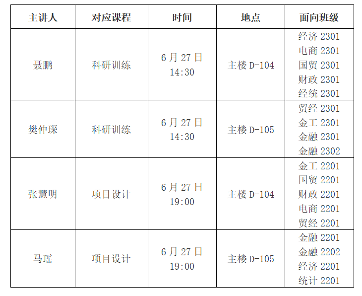 为提升经金学院本科生论文写作能力,全面提高本科毕业论文质量,学院依托培养方案集中实践环节的《科研训练》与《项目设计》两门必修课程,开设“论文写作能力强化”系列讲座。内容主要涵盖论文写作的选题、基本框架、资料搜集、数据分析,以及论文的规范格式等,通过系列讲座夯实集中实践环节的理论讲授,为本科生毕业论文撰写打好基础,系列讲座具体安排如下: