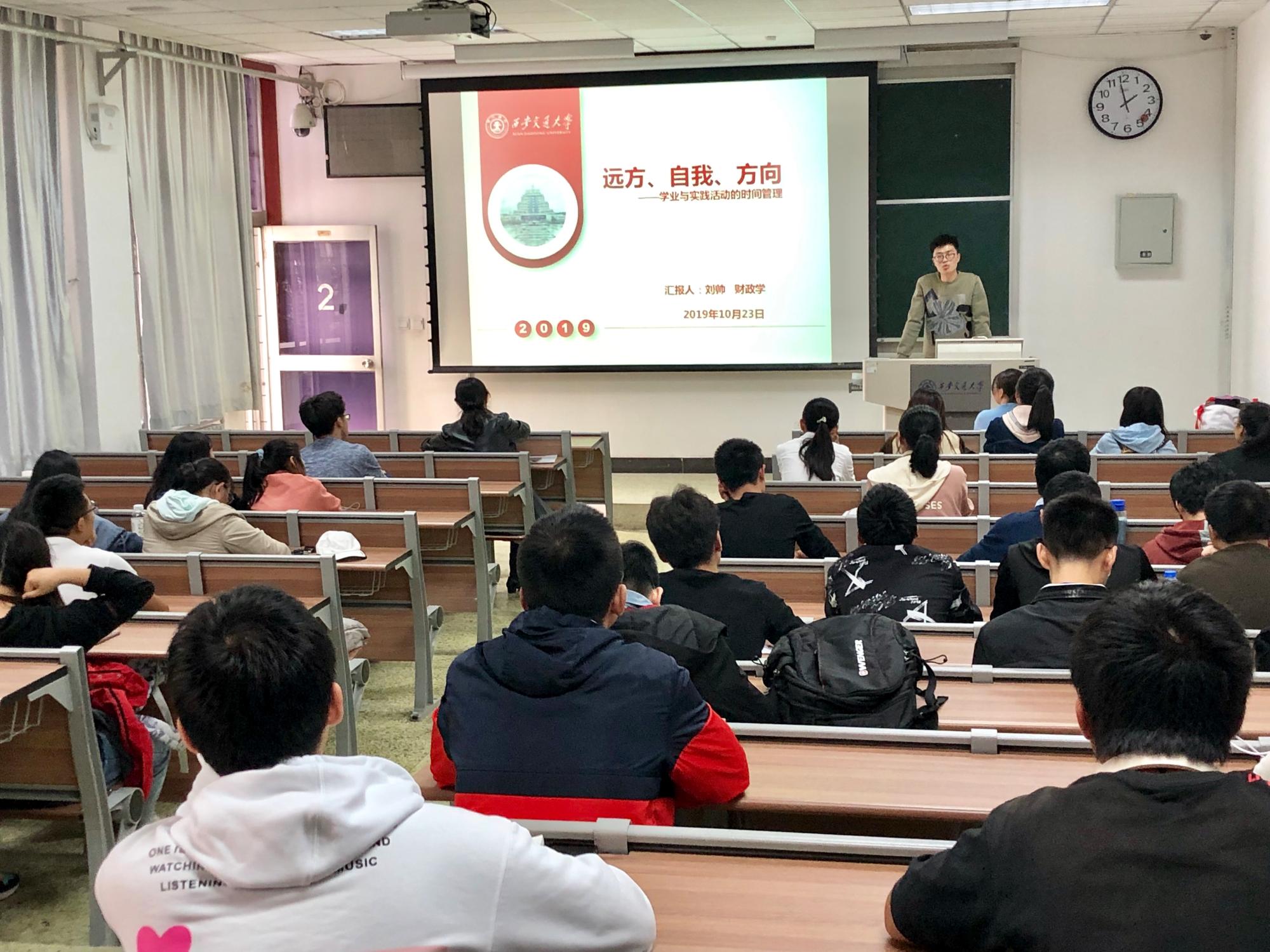 刘帅介绍了自己在学业与实践活动之间的时间管理方法,从“远方—明确人生目标”、“自我—学业与学生活动”以及“方向—心之所向,素履以往”三个方面,详细介绍了自己初入大学校园如何确立人生目标,一步步朝着自己设定的方向努力。高慧敏以“画竹必先成竹于胸”为引,总结了自己参加各类学科竞赛的经验和心得,强调参赛过程中应始终保持平常心,享受比赛过程,实现效用最大化。张学智分享了自己对大学不同阶段的理解:大一要自我定位,认清自己的优势和不足;大二要进一步明确未来发展方向,决定分流专业;大三、大四则应该脚踏实地,朝着自己心中的远方前进。