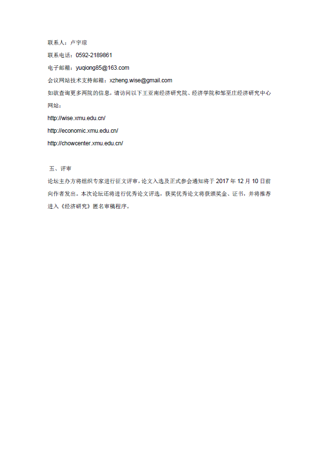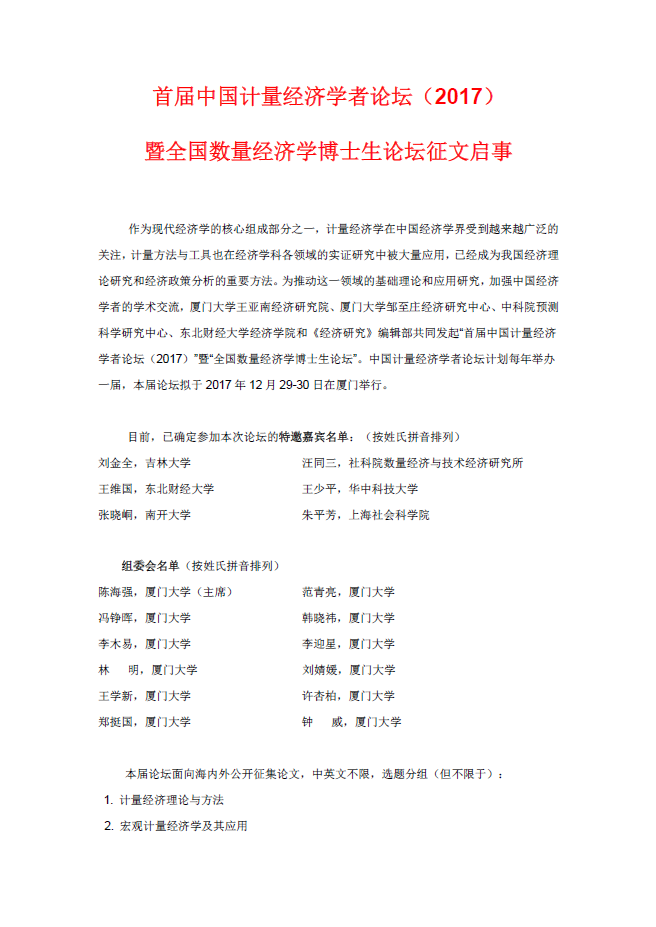 首届中国计量经济学者论坛(2017)暨全国数量经济学博士生论坛征文启事