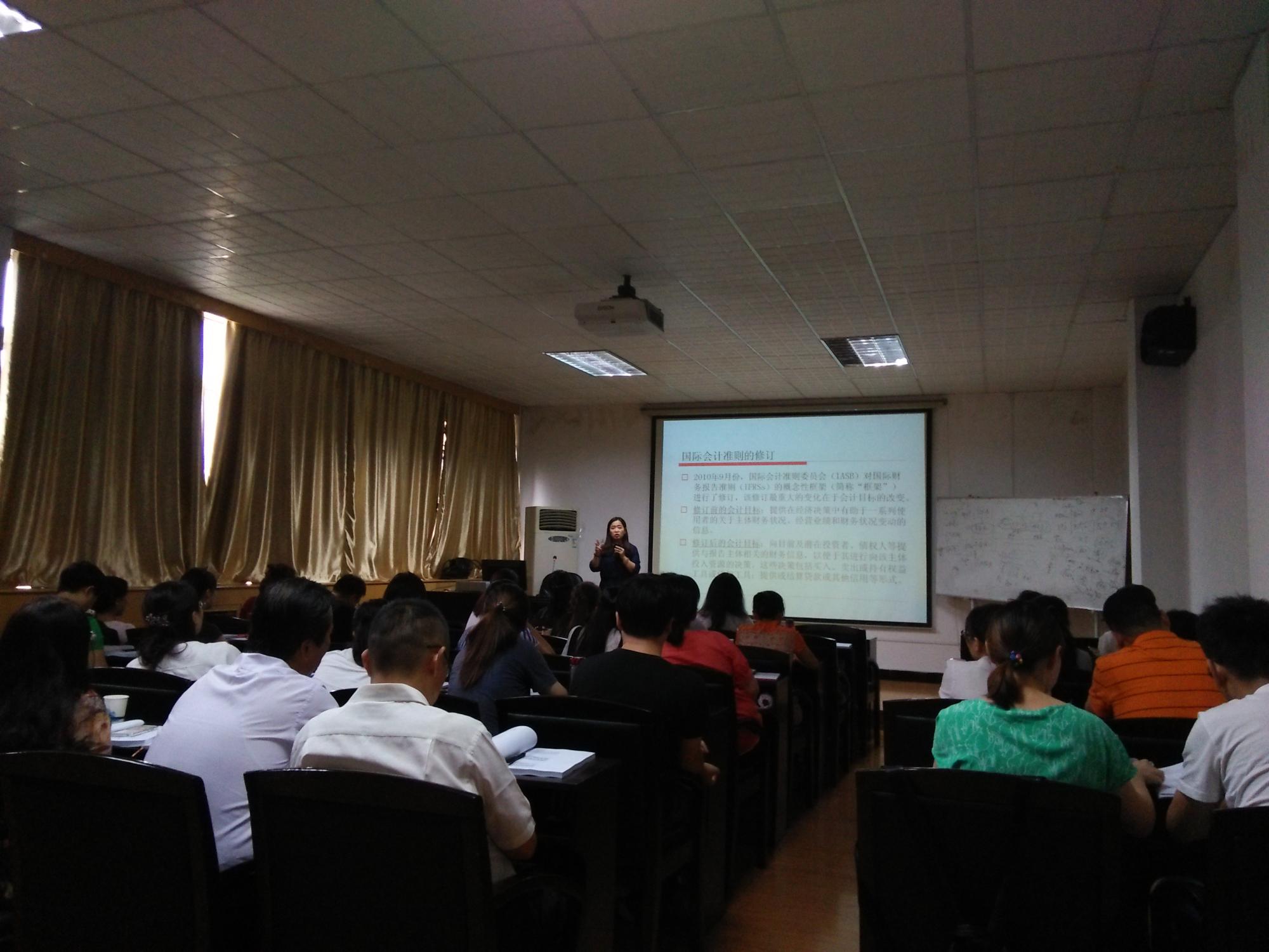 8月1日日上午,西安曲江文化旅游股份有限公司财务总监狄洁华女士、经济与金融学院高培中心王凌云主任、史芳丽副主任对参加本次培训的学员表示了热烈欢迎,并对此次培训的课程设置和师资安排进行了简单介绍,同时表达了希望各位学员能够在短短五天的学习中尊师重道、教学相长、学以致用的殷切期望。本次培训在我院杨丽荣副教授“新会计准则”主题报告下拉开了帷幕。参加本次培训的共有38人,学员们学习热情高涨,课堂中积极参与互动讨论。并表示要结合教授们课堂上所讲授的理论知识来解决工作当中亟待处理的实际问题。