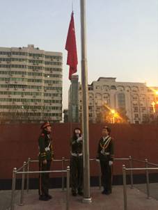 7点30分,升旗仪式正式开始。迎着朝阳,国旗护卫队成员迈着铿锵的步伐来到了国旗台下。在激昂的《义勇军进行曲》中,护旗手振臂一挥,鲜艳的五星红旗随风展开,升旗手将五星红旗徐徐升起。