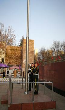 天微微亮,国旗护卫队成员迈着铿锵的步伐来到了国旗台下,全场一片肃静。在激昂的《义勇军进行曲》中,护旗手振臂一挥,鲜艳的五星红旗随风展开,升旗手随之将五星红旗徐徐升起,五星红旗在晨曦中迎风飘扬在旗杆顶端。全体同学也缓缓行注目礼,唱国歌,表达自己对神圣的国旗和祖国的热爱。