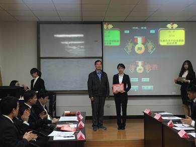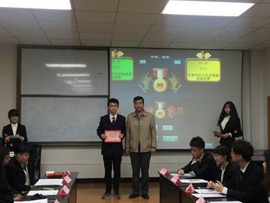 决赛期间,经金学院党委副书记周建伦老师和经金学院团工委书记王平老师莅临决赛现场当评委并作了精彩的点评。辩论赛结束后,周老师和王老师为获奖班级和最佳辩手颁发了荣誉证书并且合影留念。