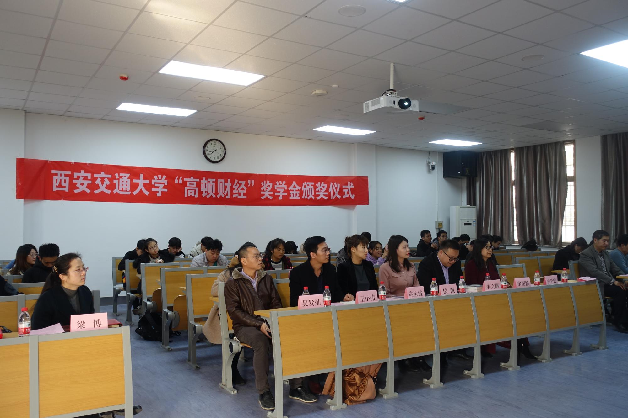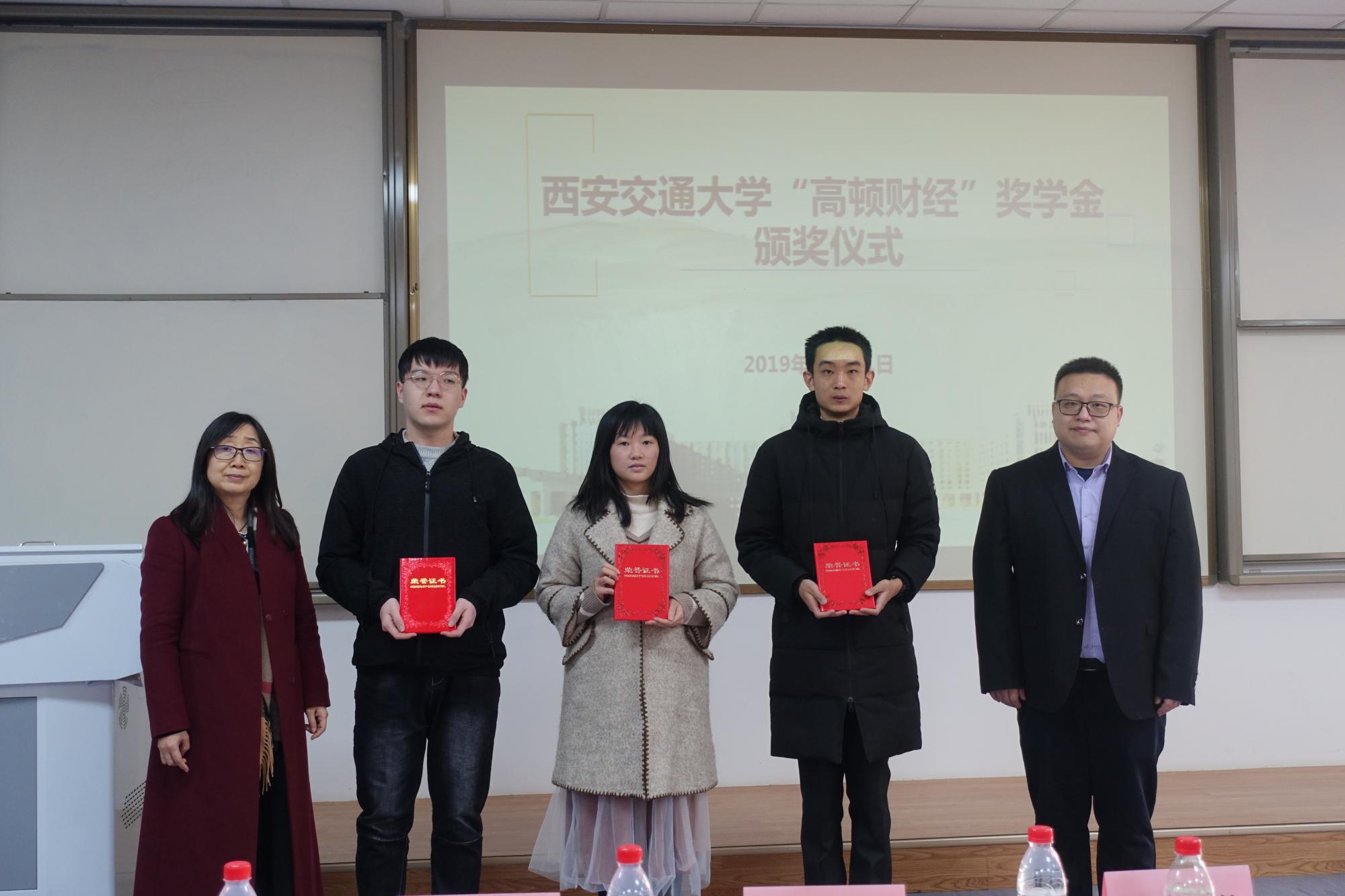 12月11日下午,2019年西安交通大学 “高顿财经”奖学金颁奖仪式在财经东配二楼举行。高顿教育集团领导、经金学院、启德书院和宗濂书院领导以及辅导员老师出席仪式,并为在名企实习、国际名校研学、大学生创业、社会实践四方面表现突出的11位同学以及5个团队给予表彰奖励。颁奖仪式由经金学院周建伦副书记主持。