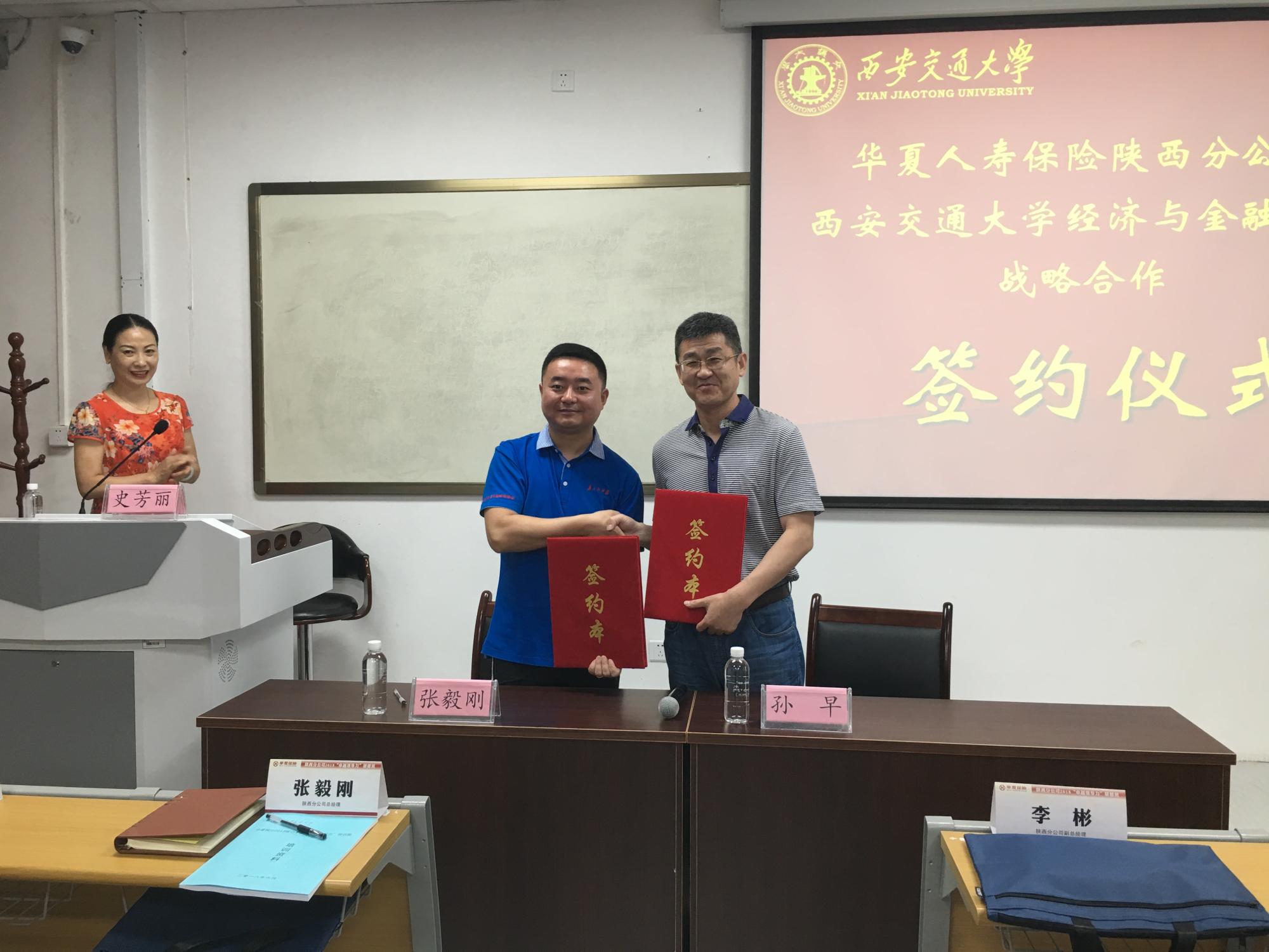 6月22日,华夏保险陕西分公司与西安交通大学经济与金融学院签署战略合作协议,双方本着“优势互补、重点推进、互利共赢”的原则,充分发挥各自的优势,促进产、学、研共同发展。西安交通大学经济与金融学院孙早院长,华夏保险陕西分公司张毅刚总经理出席了本次签约仪式。