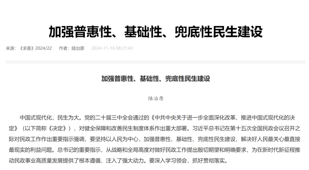 11月16日出版的新一期《求是》杂志,刊发民政部党组书记、部长陆治原的署名文章《加强普惠性、基础性、兜底性民生建设》。文章指出,我国仍处于社会主义初级阶段,必须立足这一基本国情,深化民政领域改革创新,完善政策制度体系、服务保障体系、监督管理体系、社会参与体系,将有为政府、有效市场、有情社会、有责家庭有机结合,共同把民生保障的事情办好。