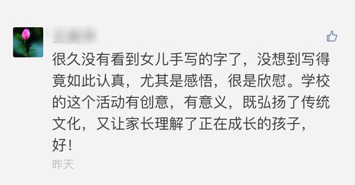 在3月18、19日进行了为期两天的“我最喜爱的作品”线上投票,两天时间在校内外获得了广泛的关注和参与,有近7200人参与了微信线上投票,活动推文的阅读量更是达到了1.3万,在200多条留言中,有家长写道:“很久没有看到女儿手写的字了,没想到写得竟如此认真,尤其是感悟,很是欣慰。学校的这个活动有创意,有意义,既弘扬了传统文化,又让家长理解了正在成长的孩子,好!”