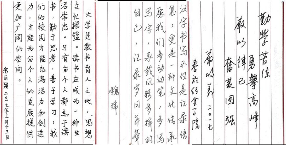 为弘扬中国传统优秀文化,丰富学生校园生活,3月9日-3月27日,经济与金融学院研究生会在西校区开展了“见字如面”书法比赛活动,并取得圆满成功。活动以“分享一段感动你我的文字”为主题,为同学们提供了一次精神交流的机会。通过一周时间的作品征集,本次活动收到了许多的优秀作品,同学们或摘抄有力量的文字,分享自己的感悟;或大笔一挥,展现自己良好的书法功底,活动最终通过微信线上投票和专业老师打分两个环节,评选出获奖作品。