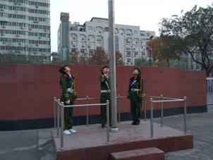 七点十五分,国旗班成员在国旗台前准备就绪,参加升旗仪式的其他同学也都自觉地站成整齐的队伍,等待升旗仪式的到来。