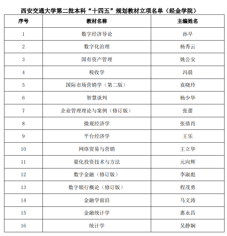 根据《关于做好“十四五”普通高等教育本科国家级规划教材建设和推荐工作的预通知》要求,学校教务处日前组织开展了第二批校级本科规划教材建设项目的推荐工作。根据专业内涵建设情况和发展规划,经金学院16本前沿性、创新性强的高水平专业核心教材被认定为西安交通大学第二批本科“十四五”规划教材。学院向获批教师表示热烈祝贺,希望教材编写团队合理安排编写任务,高质量完成规划教材编写工作。