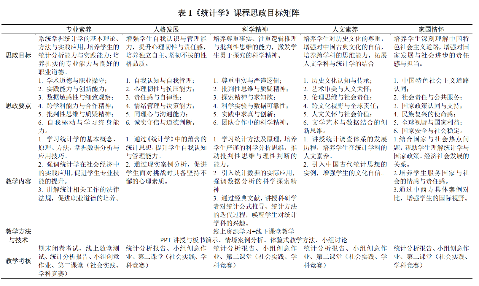 教学团队立足学科本源,围绕“用统计学讲好中国故事”主题主线,深挖《统计学》蕴含的思政元素,构建起涵盖专业素养、人格发展、科学精神、人文素养与家国情怀的五维思政元素体系,并据此设计了相应的课程思政目标矩阵,推进了知识阐释与价值引领的同向同行。在具体的融入路径上,课程从统计数据映射现实、统计思想蕴含哲理和学科发展承载使命三个层面系统推进。