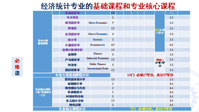 经济统计学专业培养方案共148学分,其中课程教学122学分,集中实践18学分,课外实践8学分。课程教学包括通识教育类课程37学分、经济学大类平台课程52学分和专业课33学分。大一和大二主要学习通识和经济学基础课程,专业课程集中在大三和大四学年。