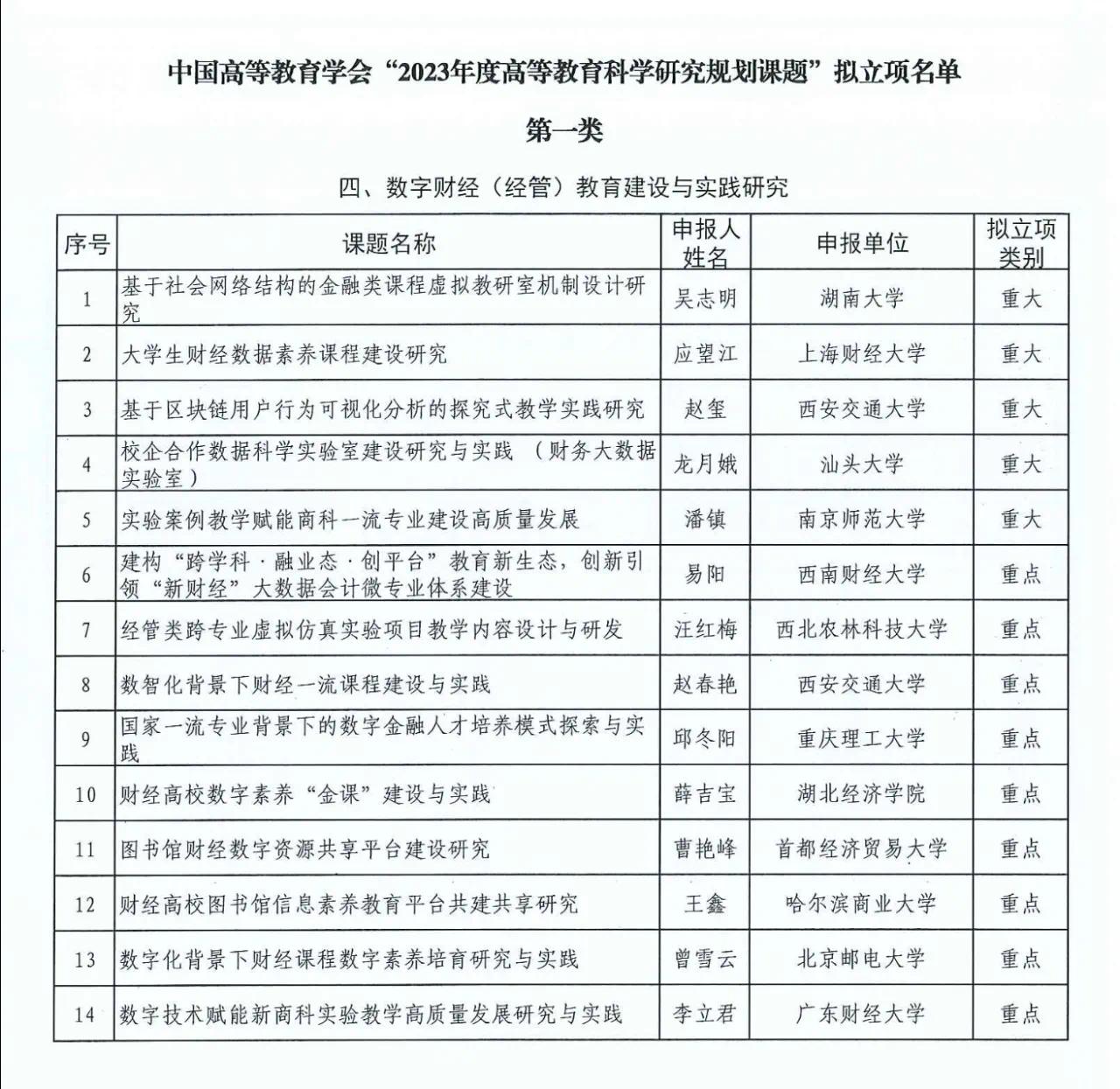 近日,中国高等教育学公布了“2023年度高等教育科学研究规划课题”立项名单,经金学院赵春艳教授获批重点课题1项,学院向赵春艳教授表示热烈祝贺,希望全体教师积极参与教育教学改革研究,为学院高质量发展注入新动能,进一步提升学院人才培养质量。