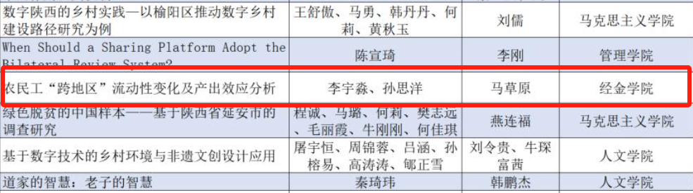 近日,陕西省教育厅、学位委员会公布了陕西省第八届研究生创新成果展高质量成果名单,西安交大获评27项高质量成果,我院马草原教授及博士生李宇淼、孙思洋合作完成的学术论文“农民工跨地区流动性变化及产出效应分析”(发表于《中国工业经济》2023年第9期)入选。