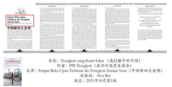 杨惠斯同学热爱写作,用亲身经历讲述她与中国的美丽邂逅,曾参与发表印度尼西亚语书籍《我们眼中的中国》之《中国新四大发明》、《千岛日报》—印尼留学生园地之《防控疫情,你我做起!》等。