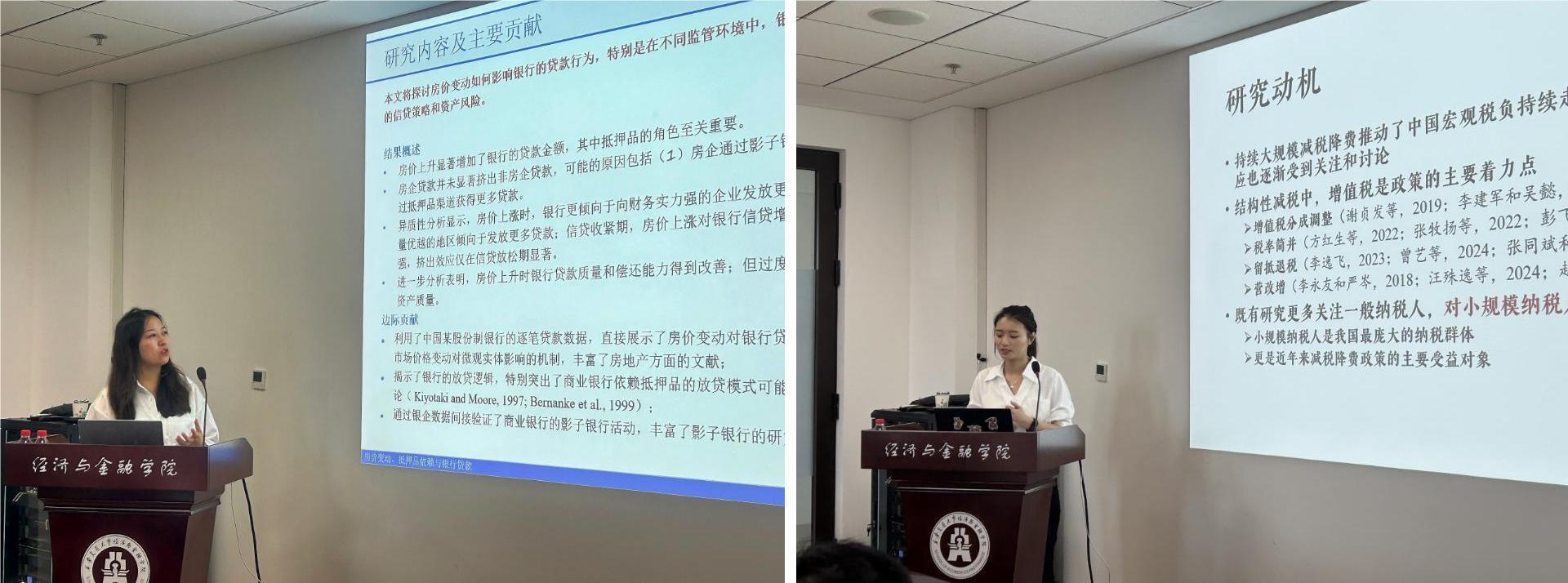 论坛共报告了6篇论文,青年学者围绕抵押贷款、税收政策、局部偏差等问题分享了最新的研究成果。中央财经大学姜可心博士报告的题目是《房价变动、抵押品依赖与银行贷款》,详细探讨了房价变动如何影响银行的贷款行为,特别是在不同监管环境中,银行高度依赖抵押品的信贷模式会如何影响银行的信贷策略和资产风险。西安交通大学孙迎雪博士报告的题目是《中国税收优惠政策的有限响应与估算偏离:增值税起征点提升的证据》,文章利用2019年小规模纳税人的增值税起征点由月销售额3万元提升到10万元的改革政策作为准自然实验,使用标准双重差分法检验增值税起征点调整对小规模纳税人的减税激励效应。