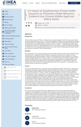 世界卫生经济大会是由国际卫生经济学协会(International Health Economics Association)主办的全球性学术会议,自1996年以来每两年举办一次,是全世界卫生经济学领域最盛大的顶级国际会议。第十五届世界卫生经济大会由非洲最古老的卫生经济学研究中心——开普敦大学卫生经济学部主办,大会主题为“卫生经济学的多样性”(Diversity in Health Economics)。会上,吴静娴助理教授作了题为“Association Between Social Health Insurance and Hypertension Control Among Middle-Aged and Elderly Chinese Adults: A Mediation Analysis”的口头报告,以及题为“Inequality in Unmet Healthcare Needs under Universal Health Insurance Coverage in China”的海报报告。博士生陈丹蕾同学在线作了题为“Impact of Supplementary Private Health Insurance on Preventive Health Behaviors: Evidence from Chinese Middle-aged and Elderly Adults”的海报报告,硕士生刘加旺同学在线作了题为“Did More Generous Social Heath insurance Lead to Ex-ante Moral Hazard? Evidence from Rural Residents in China”的口头报告。以上论文报告从不同角度探讨了我国全民医保制度背景下的居民健康行为与健康结果,均为吴静娴助理教授所主持的国家自然科学基金青年项目的阶段性研究成果。与会专家充分肯定了上述研究的意义,并对研究结果的可推广性展开了深入交流。