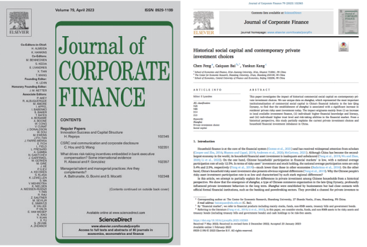 学院青年教师冯晨博士以第一作者署名与山东大学、中央财经大学等学者合作完成的论文从社会资本理论视角给出重要的理论解释。研究发现,晚清“商会”这一商业组织的建设深刻影响了我国家庭的长期投资活动,且此影响主要可由商会建设下的本地金融可得性提升、私人投资者金融素养的增加以及家庭对金融市场的信任水平与冒险倾向的上升给予有力解释。近日,上述成果以“Historical Social Capital and Contemporary Private Investment Choices”为题正式发表于公司金融领域国际高水平期刊Journal of Corporate Finance上。西安交通大学经济与金融学院为第一署名单位。
