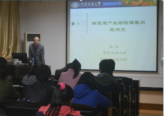 接着,魏玮教授围绕我们今天的主体——新能源产业结构调整问题研究,从四个方面进行了细致的阐述。他先指出了我国能源产业的现状,其中重化工化与发展低碳经济之间的矛盾尤为突出。碳排放在发达国家和发展中国家存在很大差异,发达国家的碳排放的来源集中在消费领域,而发展中国家集中在生产环节,所以,在中国发展新能源产业,尤其是发展以发电为主的新能源产品,十分必要。然后,魏教授介绍了我国新能源产业的发展状况。2006年以前,虽已提出要发展新能源产业,但因为传统能源产业对经济增长速度的支柱性影响,新能源产业实际发展并不大。直到2006年政府颁布并实施的《中华人民共和国可再生能源法》,新能源产业才快速发展起来。新能源产业主要包括太阳能产业(其中包括太阳能热水器产业和光伏产业)、风能产业和生物质能产业。并提出了冷热电多联产的模式——一个原料来源经过技术转化后可以制冷、供热、发电,这将是一种更为高效的提供能源的方式。魏老师又指出了我国新能源产业所面临的主要困境:一是我国在全球能源产业的产业链中处于较低的层次,利润低的同时,竞争激烈;二是产业与市场倒挂,即国内市场不足,主要依靠国外市场并易受其影响,同时政府真正强有力的产业支持政策不足;三是盲目扩张导致产能过剩。最后,针对于当前的困境,老师提出了我国新能源产业结构调整的思路。必须清楚认识陷入困境的本质是“重制造,轻技术;重国外,轻国内”的产业发展思路的必然结果。具体的调整思路包括:第一,加快新能源技术的创新和扩展,提升在产业价值链分工中的地位;第二,重视光伏产业的基础技术研究,统筹科研、生产和应用;第三,产业梯度转移由“产业链整体式转移”取代“产业链分拆式转移”,“高端技术合作”取代“”低端产业转移;产业链由实转虚、由重变轻、由硬变软,现代服务业与先进制造业融合发展。